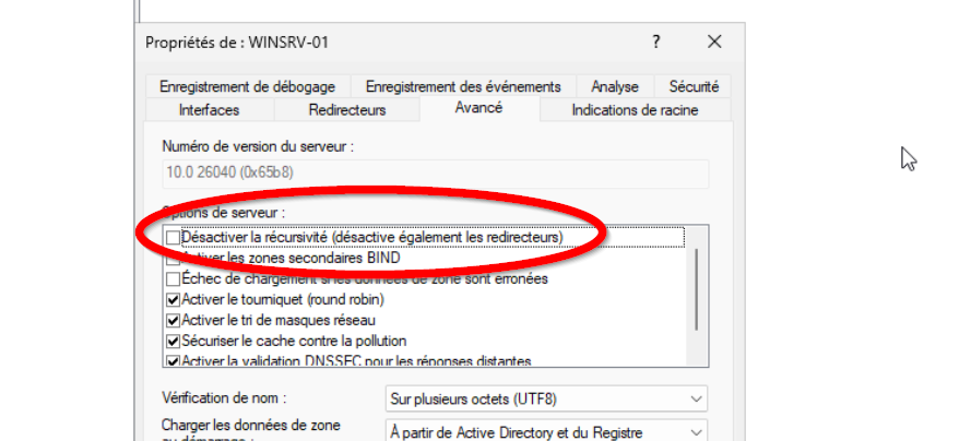 - Dans les options du serveur, cochez la case Désactiver la récursivité…, puis cliquez sur OK.